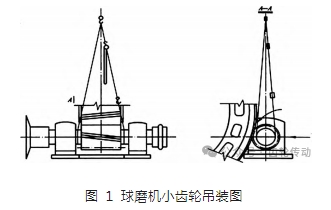 小齒輪軸須待基礎混凝土強度達到 75% 以上,并經各相關方現場檢查合格后,方可在基礎上安裝。清除主底板頂面和軸承座底面的雜物、毛刺和油污。在主軸承底板和地基上畫垂直和水平的中心線,作為安裝的參考線,然后把地腳螺栓和底板固定在基礎上,在底板下放置墊鐵,將底板的位置調整正確。球磨機主軸底板上加工面須位于同一水平面上。在安裝時,用水準儀、水平儀等測量設備進行測量。通過大錘、墊鐵、千斤頂等工具進行調整,達到設計要求。其縱向及橫向水平度誤差小于 0. 1 mm/m,底板的相對高差小于 0. 5 mm,且進料端高于出料端。軸承底板縱向中心線的同軸度偏差應小于 1 mm,橫向中心線平行度偏差應小于 0. 5 mm/m。在底板上安裝軸承座,確保兩者的中心線全部對齊。軸承座和底板之間的接觸面須在周圍分布均勻,避免出現局部空隙長度大于 0. 1 mm;未接觸的邊界長度不應大于 100 mm,而總長度也不應超出周圍總長的 25% 。安裝球磨機小齒輪組件時,先在行車吊鉤上掛兩根繩扣,如圖 1 所示。