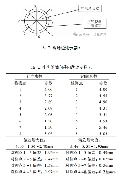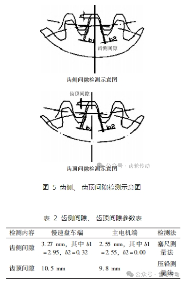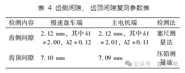 從表 2 中數字看,齒頂間隙超出廠家標準值(齒頂間隙 5. 5mm,齒側間隙 1. 88 mm)。由于大小齒輪形為斜齒,檢查齒輪嚙合情況時是以齒側間隙參數為準則,齒頂間隙參數只做參考。