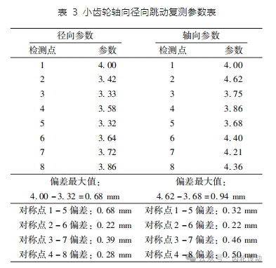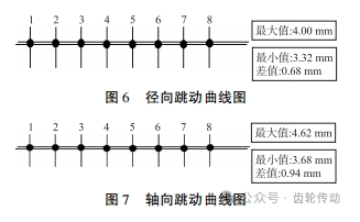 小齒輪軸向校正與徑向校正方法相同,可參照徑向校正的作業流程進行,以達到廠家要求的(0.80 mm以內)為止。完成軸向、徑向校正工作后,再對跳動值復查檢測,所得數字如圖 6、圖 7 所示: