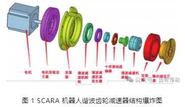 根據(jù)《機(jī)器人用諧波齒輪減速器》(GB/T 30189—2014)結(jié)構(gòu)說明中對諧波齒輪減速器定義,它是一種靠波發(fā)生器使柔輪產(chǎn)生可控的彈性變形波,通過與剛輪的相互作用,實現(xiàn)運動和動力傳遞的傳動裝置。其輸入和輸出轉(zhuǎn)向相反,即:波發(fā)生器輸人,剛輪固定,柔輪輸出;或柔輪固定,剛輪輸出,其結(jié)構(gòu)爆炸圖如圖 1 所示。