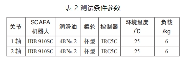 首先選取兩個型號為 CSG-32-100-2UH-SP 的諧波齒輪減速器,分別安裝在型號為 IRB 910SC 的 SCARA 機(jī)器人的軸 1 和軸 2 位置,選取 4BNo.2 作為潤滑油,使用型號為 IRC5C 控制器,試驗室環(huán)境溫度維持在 25±1℃,帶載砝碼為額定負(fù)載 6kg,具體參數(shù)見表 2。
