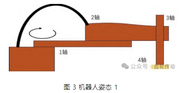 2)運行姿態(tài)初始化:IRB 910SC 的 SCARA 機(jī)器人設(shè)置初始姿態(tài),軸 1、軸 2 均與地面保持 90°,整體保持水平,旋轉(zhuǎn) 1 軸,姿態(tài)如圖 3 所示。