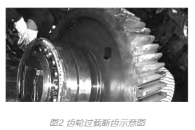2) 過載斷齒: 過載斷齒是由于瞬時超過了齒輪的承載能力而導致齒面或齒根斷裂(見圖2)。 這種情況可能發生在瞬時負載或沖擊負載作用下;