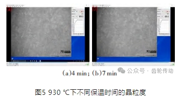 加熱溫度930 ℃下晶粒度變化:考慮實際生產過程中滲碳晶粒度的加熱溫度,在模擬過程中低溫設置在930 ℃,同樣的加熱方式分別截取保溫4 min和7 min時試樣的實時晶粒度照片如圖5。