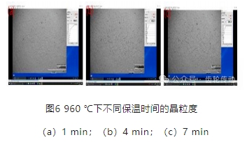 加熱溫度1 100 ℃下晶粒度變化:由于高溫顯微鏡單次實驗時間總長的局限性,先以20 ℃/s的速度快速將試樣升溫至700 ℃,再以 2 ℃/s的速度升溫至1 100 ℃,保溫8 min,分別截取保溫 1 min,4 min 和 7 min 時試樣的實時晶粒度照片如下圖4。