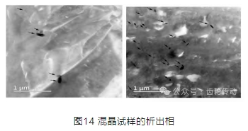 混晶試樣的透射電鏡樣品如下圖 14,可以明顯的看出 AlN 析出相的尺寸不均勻,在部分視場中,同時存在 100~200 nm 和<100 nm 大小的析出相,有些區域也存在均勻分布的析出相。在數量上也存在著不均勻的現象,有的視場中均勻細小的分布,有的視場中則數量較少甚至是沒有。