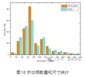 分別對晶粒均勻和出現混晶兩個試樣隨機取 20 個視場進行析出相數量和尺寸統計分析,結果如圖18所示。