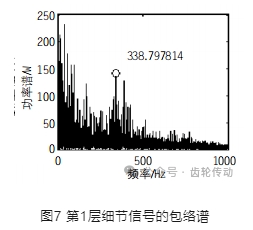 為了提取外圈故障頻率,進一步對第1層細(xì)節(jié)信號d1做Hilbert包絡(luò)并進行譜分析。從功率譜的分析中可以發(fā)現(xiàn)頻率338.8Hz的存在,如圖7所示,而軸承故障特征頻率為外圈通過頻率f0及其倍頻,理論計算得到f0=338.1Hz,通過對照可知,軸承的處圈發(fā)生了點蝕故障。
