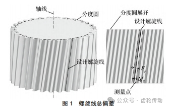針對漸開線螺旋線,采樣點分布應(yīng)盡可能的均勻。螺旋線是一條連續(xù)曲線,螺旋線總偏差也應(yīng)該是一個連續(xù)量。齒輪螺旋線采樣如圖 3 所示。理論上采樣間隔越小,越能夠反映螺旋線的真實情況,考慮齒面區(qū)域存在倒角等情況,齒面的計值區(qū)域應(yīng)相應(yīng)減小。通常將采樣起始點定在距齒輪端面 50 mm,后續(xù)測量點沿螺旋線方向,間隔不超過 100 mm 進行采樣,一個螺旋線采樣數(shù)約為 15~20 個。
