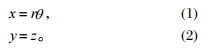 假設(shè)齒輪圓柱坐標為 (r,θ,z),當齒輪沿分度圓母線裁剪展開為平面后,測量點坐標值可變?yōu)?(x,y)。其中,x 為原先的圓柱截面弧線伸展的直線,長度等于原先的弧長;y 值對應(yīng)原先的 z 值不變,則此時有