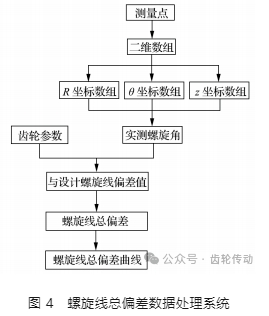 螺旋線總偏差數(shù)據(jù)處理過程是通過軟件編程,將齒輪螺旋線偏差的數(shù)學(xué)模型嵌入處理軟件。齒輪螺旋線總偏差檢測數(shù)據(jù)處理系統(tǒng)如圖 4 所示。