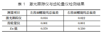 螺旋線總偏差的檢測方案通過試驗來進行驗證。試驗驗證的對象齒輪模數(shù)為 40,齒數(shù)為 25,壓力角為 20°,軸向齒寬為 500 mm,螺旋角為 0°,左旋。分別使用激光跟蹤儀對左右齒面進行測量,結(jié)果如表1 所列。由于對比判據(jù)均小于 1,激光跟蹤儀檢測精度與傳統(tǒng)檢測方法的精度符合其評定的要求,滿足實際生產(chǎn)的需要。