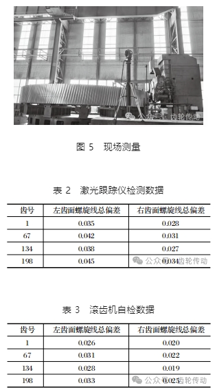使用激光跟蹤儀現(xiàn)場測量齒輪螺旋線,如圖 5 所示,檢測數(shù)據(jù)如表 2 所列。使用滾齒機對螺旋線總偏差進行自檢,自檢數(shù)據(jù)如表 3 所列。