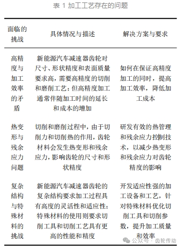 盡管新能源汽車減速器齒輪的加工工藝已經(jīng)取得了顯著的進(jìn)步,但在實(shí)際生產(chǎn)過程中仍存在一些問題和挑戰(zhàn)。高精度加工要求與加工效率之間的矛盾是亟待解決的問題。新能源汽車減速器齒輪對尺寸精度、形狀精度和表面質(zhì)量的要求極高,這要求加工過程中必須采用高精度的切削和磨削工藝。然而高精度加工往往意味著加工時間的延長和加工成本的增加,如何在保證加工精度的同時提高加工效率是當(dāng)前加工工藝面臨的重要挑戰(zhàn)。加工過程中的熱變形和殘余應(yīng)力問題也是影響齒輪加工質(zhì)量的關(guān)鍵因素。在切削和磨削過程中由于切削力和切削熱的作用齒輪材料會發(fā)生熱變形和殘余應(yīng)力,導(dǎo)致齒輪的尺寸精度和形狀精度發(fā)生變化。因此如何有效控制加工過程中的熱變形和殘余應(yīng)力是提升齒輪加工質(zhì)量的關(guān)鍵所在。此外新能源汽車減速器齒輪的復(fù)雜結(jié)構(gòu)和特殊材料也給加工工藝帶來了難度。齒輪的復(fù)雜結(jié)構(gòu)要求加工過程中必須具備高度的靈活性和適應(yīng)性;而特殊材料的使用則要求切削工具和切削工藝必須具備更高的性能和精度。這些都對加工工藝的創(chuàng)新和優(yōu)化提出了更高的要求。加工工藝存在的問題如表 1 所示: