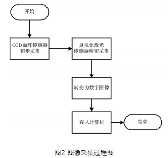 齒輪小缺陷測量的精度要求較高,圖像采集精度對尺寸測量精度有直接影響,用CCD面陣傳感器與點視覺激光傳感器結合方式,提升圖像采集精度。通過CCD面陣傳感器完成對齒輪圖像的初步采集,再用精度為 0.1 μm 的點視覺激光傳感器采集齒輪小缺陷位置圖像,提升圖像采集精度。過程如圖2所示。