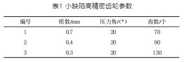 為檢驗本文方法精度,選 3 個相同種類小缺陷的高精密小模數齒輪,用本文方法、數字化測量(文獻方法)及激光測量(文獻方法)小缺陷尺寸,對比 3 種方法測量結果,并與實驗室用接觸測量的結果進行對比。3個高精密齒輪參數,見表1。