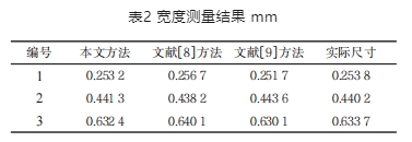測量結果對比:用3種方法處理圖像后,進行小缺陷的寬度測量,測量結果與實際尺寸,如表2所示。