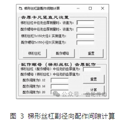 利用 Visual Bas? ic 可視化程序編制的梯形絲杠副配作間隙計(jì)算程序可以便捷、高效地實(shí)現(xiàn)最佳間隙要求,以 Tr150×24 為例,程序界面圖如圖 3 所示。