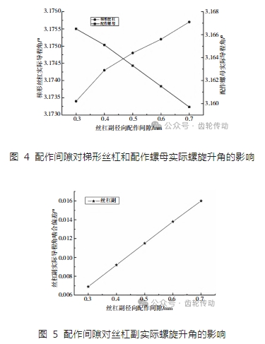由圖 4、圖 5 分析可知,梯形絲杠的實(shí)際導(dǎo)程角與梯形絲杠副的徑向配作間隙呈正比,配作螺母的實(shí)際導(dǎo)程角與梯形絲杠副的徑向配作間隙呈反比。梯形絲杠副的實(shí)際螺旋升角嚙合偏差與其徑向配合間隙值呈正比,在徑向配作間隙 0. 3 ~ 0. 7 mm 范圍內(nèi),實(shí)際螺旋升角嚙合偏差最大為 0. 016°,即 0. 96′,考慮到梯形螺紋牙型半角存在偏差,徑向配作間隙對(duì)傳動(dòng)平穩(wěn)性的影響可以忽略,其徑向配作間隙僅影響傳動(dòng)過(guò)程的發(fā)熱與存儲(chǔ)潤(rùn)滑油。