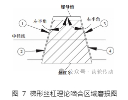 梯形絲杠副的嚙合區(qū)域大小影響其傳動(dòng)的平穩(wěn)性、自鎖性、絲杠副的磨損和牙面接觸壓力,因此應(yīng)盡可能增大接觸面積,保證足夠的嚙合區(qū)域。當(dāng)梯形絲杠和配作螺母的牙型半角與標(biāo)準(zhǔn)值相比存在偏差,絲杠副傳動(dòng)時(shí)配作螺母在梯形絲杠的牙面嚙合區(qū)域以中徑線為邊界,分為 4 部分(①、②、③、④)。