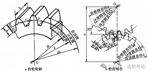 注:z—齒數;da—齒頂圓直徑;df—齒根圓直徑;d—分度圓直徑;h—齒高;p—齒距;s—齒厚;ha—齒頂高;hf—齒根高;d’—節圓;α—壓力 角;α’—嚙合角。