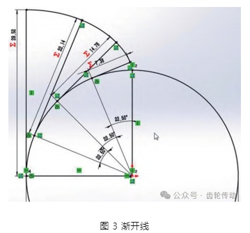 模擬發生線在基圓做純滾動,發生線沿基圓滾過的線段長等于基圓上被滾過的相應弧長,以此創建漸開線,如圖 3 所示。