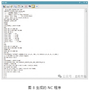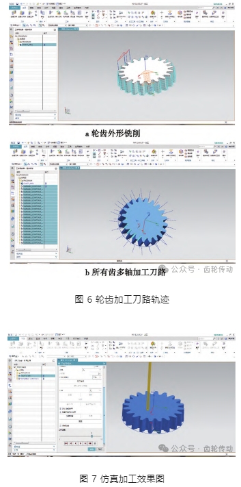 在 UG 軟件中,打開由 SolidWorks 構建好的齒輪模型,創建輪齒加工刀路軌跡,如圖 6 所示。首先銑削整個齒輪外形(圖 6a),接著創建單個輪齒的多軸銑削刀路,通過路徑轉換旋轉復制,最終得到所有輪齒的加工刀路(圖 6b)。對生成刀路進行實體仿真加工,效果如圖 7 所示,NC 數控程序如圖 8 所示。