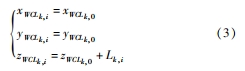 式中:xWCLk,i 、yWCLk,i 、zWCLk,i為刀位點 CLk,i在{SW}下的坐標,三者與初始刀位點 CLk,0的坐標之間的關系為: