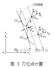 將初始刀位點投影于{SW}的坐標平面 yW zW ,建立如圖 3 所示的端面齒廓齒高方向刀位點計算示意圖,CCk,0 、CLk,0分別為刀具路徑 k 處的初始刀觸點和初始刀位點;ε1 為理論漸開線齒廓曲線,是不同刀位點CLk,0處半徑為 R 刀具圓弧形成的包絡線;ε2 為殘留高度 h 殘留點所在曲線,ε3 為刀位點 CLk,0 所在曲線,曲線 ε2 、ε3 均為漸開線等距曲線。