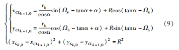 刀位點 CLk + 1,0 與 Gk,0 之間的距離為R,同時 CLk+1,0點位于曲線 ε3 上,根據這一幾何關系,CLk+1,0 點可通過式(9)求取。