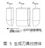 步驟 2:生成刀具掃掠體。如圖 5 所示,建立刀位點 CLk,0和刀位點 CLk,i刀具掃掠輪廓線,構造出刀具掃掠面 FSwept、刀位點 CLk,0 處刀具回轉面的切入部分 FIngress、刀位點 CLk,i處刀具回轉面的切出部分 FEgress,將上述 3 個面通過縫合方法建立刀具掃掠體;