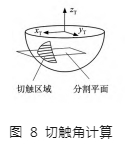 步驟 5:切觸角計算。如圖 8 所示,在刀具坐標系下,利用平行于刀具軸線的一組平面和代表刀具接觸區域的球面進行求交,得到所有相交的圓弧,通過圓弧端點計算出刀具切入角和切出角;