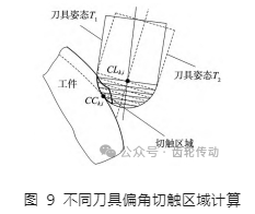 如圖 9 所示,同一刀位點,當其余切削參數恒定不變的情況下,僅改變刀具偏角,形成的 T1 和 T2 兩種不同刀具姿態下的切觸區域具有相同的幾何特征;在已知刀具姿態 T1 的切觸區域時,可通過刀具姿態 T2 的所在的刀具坐標系下利用曲面分割計算新的切觸角度區間,減少重復計算所導致的時間消耗。