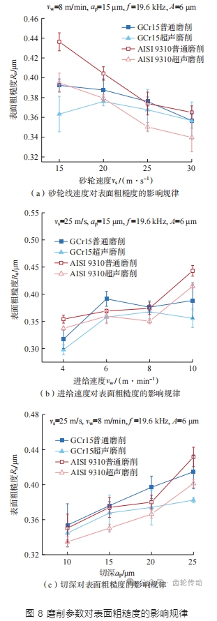 本文對比了淬硬齒輪鋼 AISI 9310 和軸承鋼 GCr15 的超聲振動輔助磨削加工性。通過搭建齒輪鋼淬硬表面超聲振動輔助磨削試驗平臺,設計單因素試驗研究磨削加工工藝參數對磨削力、表面粗糙度的影響規律及作用機制,并分析了磨削表面微觀形貌及其影響因素,為制定超聲振動輔助磨削加工策略奠定基礎。
