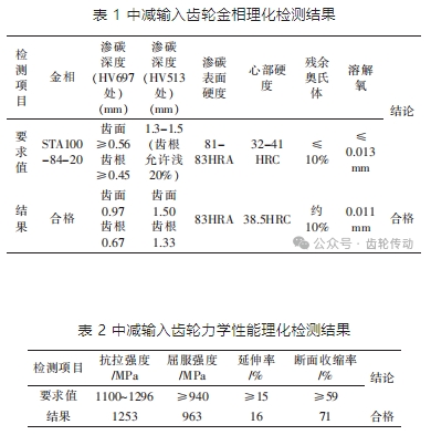 對故障件中減輸入齒輪進行理化分析,理化檢測結果合格,具體情況(見表 1、表 2)。