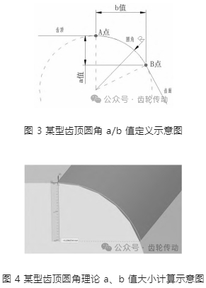 復測中減輸出齒輪齒頂圓角 (工作面)為 R0.319~ 0.465,符合設計 R0.3~0.5 要求。為更好的描述齒頂圓角轉接情況,引入齒頂圓角 a、b 值作為輔助判斷齒頂圓角與齒面、齒頂轉接良好情況。齒頂圓角 a、b 值概念:齒輪齒頂與齒面轉接通過圓角進行過渡,轉接圓角與齒頂、齒面會分別形成一切點(把圓角與齒頂形成的切點定義為 A 點,與齒面形成的切點定義為 B 點),兩切點間垂直和水平方向的距離分別定義為 a 值、b 值(如圖 3 所示)。因圓角設計存在公差,當中減輸出齒輪工作面圓角 R 為下差 0.3 及上差 0.5 時,通過三維軟件 UG 作圖可分別得到R=0.3 及 R=0.5 時的理論 a 值為 0.165~0.280、b 值為0.285~0.445(如圖 4 所示)。從圓角 a、b 值的產生過程可以得知:圓角 a、b 值為圓角 R 衍生的尺寸,與圓角大小及圓角的空間位置有關,能用于輔助判斷圓角轉接是否做到理論相切參考,當圓角轉接未做到理論相切時,會在 A、B 點出現異常高點,給齒面嚙合帶來不利影響。