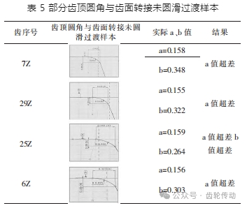 復查齒頂圓角形貌,發現多個齒頂圓角 a、b 值超差,說明齒頂與齒面轉接處未做到理論上的相切,即齒頂圓角與齒面轉接未圓滑過渡(見表 5)。