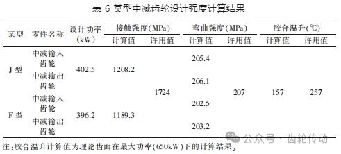 對中減錐齒輪副輪齒設計強度分析如下:設計功率下輪齒彎曲疲勞強度和接觸疲勞、最大功率下齒面膠合溫升均低于許用值(見表 6)。