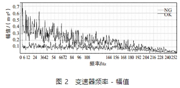 生產過程中,對變速器進行下線檢測發現,某些變速器出現異響后,可進一步使用 NVH 專用測試設備進行分析,采集振動信號,形成變速器的頻率幅值,如圖 2 所示。其中,橫坐標表示頻率,縱坐標表示該振動頻率下對應的幅值。測試過程中出現異響的變速器用NG表示,合格變速器用 OK 表示。NG 變速器在各個頻率范圍內的振動值均超過 OK 變速器,尤其在低頻率區間范圍內。