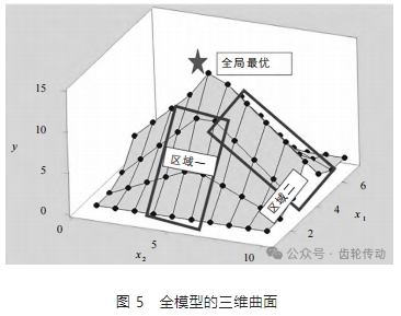 對于 2 因子響應曲面模型,通常用三維曲面圖或等值線圖表示。在圖 5 中,因子 x1、x2 與響應 y 構成 1 個三維曲面,曲面的高低表示y的大小,若曲面形成“山峰”,說明存在最優解。但實際研究過程中,由于資源有限,x1 與 x2 常常只能研究部分水平,比如圖中的區域一和區域二。在知道全模型的最優解后,方知區域一和區域二并不是最優解。但由于資源限制,試驗條件只能支持在區域一或區域二這樣大小的區域進行研究。因此,在資源條件有限的情況下,如何尋找到全局最優,需要結合等值線圖做進一步分析。