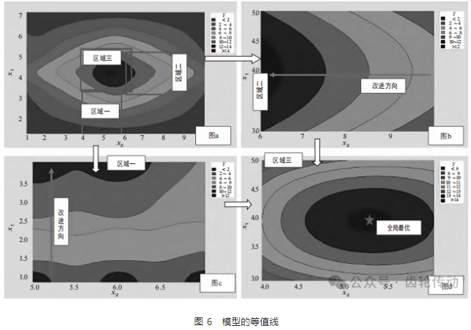 圖 6 中包含 4 張分圖:橫坐標和縱坐標分別對應因子 x1、x2,不同的等值線與顏色代表不同響應的 y 值。圖 a 表示全模型的等值線。圖 b 對應圖 a 中的區域二,在圖 b 中沿著 x2 減小的方向改善,存在最優解。圖 c 對應圖 a 中的區域一,在圖 c 中沿著 x1 改進方向存在最優解。圖 d 對應圖 a 中的區域三,通過該圖可以看到,等值線形成閉合區域,且該區域代表最大值,表示該區域存在最優設計。通過等值線圖形,找到部分區域最優,再在部分區域最優的基礎上進行 DOE,最終找到全局最優解。