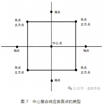 響應曲面設計中有兩種主要類型:中心復合與 Box-Behnken 設計。其中,中心復合響應曲面設計應用場景較為廣泛。如圖 7 所示,兩水平全因子設計對應圖中正方形區域,而中心復合響應曲面設計在此基礎上增加了中心點和軸點。通過增加中心點和軸點,擴充了研究對象的范圍,同時可以用來預估二階項,所以中心復合響應曲面設計是一種帶有彎曲的響應變量建模。
