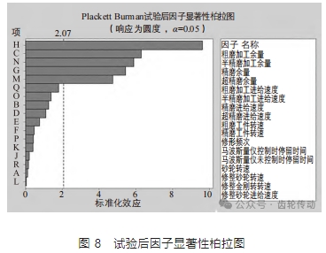 通過對圓度磨削過程的分析,識別出 17 個影響圓度的工藝參數。通過 Plackett-Burman 設計方法,從 18 個工藝參數中識別出 5 個影響顯著的因子。如圖 8 所示,分別是超精磨進給速度、精磨余量、馬波斯量儀未控制時停留時間、精磨進給速度、馬波斯量儀控制時停留時間等 5 個因子。