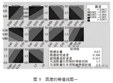 如圖 11 所示,5 個因子兩兩組合,固定其他 3 個因子,形成 10 張等值線圖形。兩兩組合等值線圖形形成閉合區域,在中間區域存在最小值。