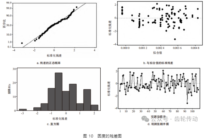 根據表 2 的結果,對模型進行簡化,剔除二階交互作用因子。剔除二階交互作用因子后,再對模型的殘差進行分析,如果圖形不符合假設,則可能模型無法充分擬合數據,導致模型不可信。殘差分析包含 3 組假設檢驗:殘差呈正態分布、殘差隨機分布且具有常量方差、殘差獨立于其他殘差。