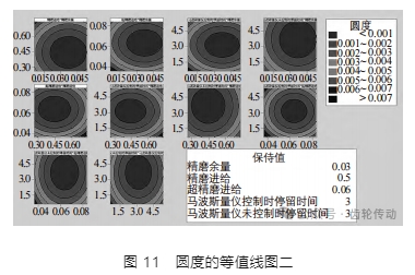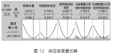如圖 12 所示,合意值為 1,滿足目標要求,當精磨余量取 0.036 9 mm、精磨進給速度取 0.445 mm/min、超精磨進給速度取 0.063 6 mm/min、馬波斯量儀控制時停留時間取 3.167 3 s、馬波斯量儀未控制時停留時間取 3.695 3 s 時,系統存在最優解。