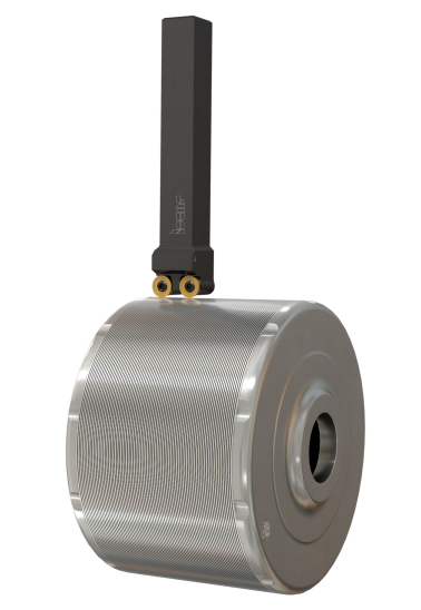 轉(zhuǎn)子由多層硅鋼片疊片構(gòu)成,采用層壓片替代實心體以降低渦流損耗。加工表面必須徹底清除切屑、油污、水漬和灰塵,且僅允許使用空氣冷卻而禁用冷卻液。這帶來雙重挑戰(zhàn):切削區(qū)域產(chǎn)生的高溫,以及碎裂切屑易粘附表面。即便如此,斷續(xù)車削的表面粗糙度要求仍極為嚴(yán)格。ISCAR通過開發(fā)創(chuàng)新型復(fù)合刀具攻克了這一技術(shù)難題。該刀具切削刃頂部與底部均集成冷卻孔,同步實現(xiàn)切削區(qū)降溫與切屑清除。兩片圓形刀片分別執(zhí)行半精加工和精加工工序,可達(dá)到Ra1.9的表面粗糙度。(圖4)