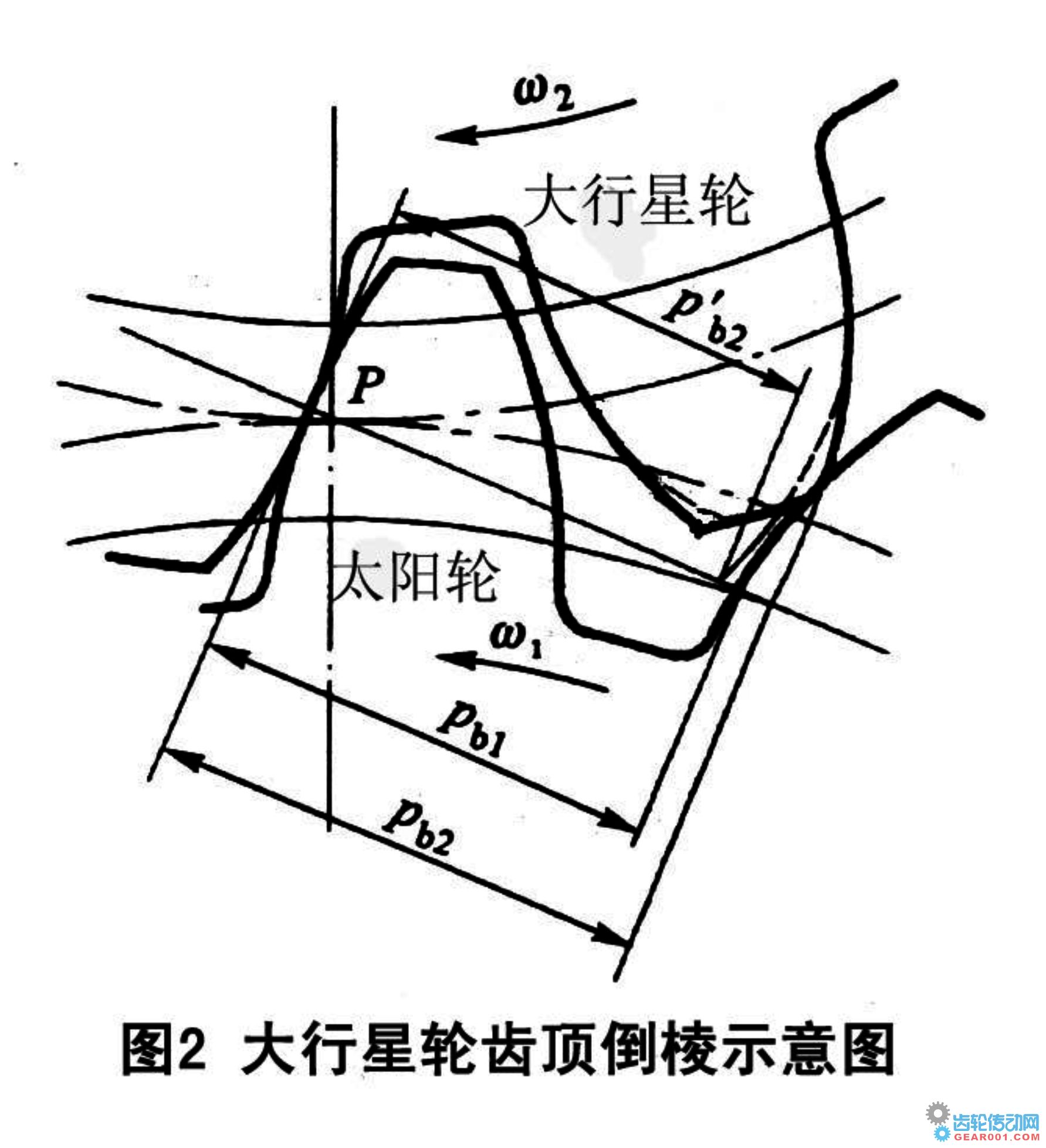 見圖2所示。因Pb2>Pb1,則后一對輪齒在未進入嚙合區時就開始接觸,從而產生動載荷。為此將大行星輪齒頂倒棱,大行星輪的虛線齒廓為齒頂倒棱后的齒廓。實線齒廓為未經齒頂倒棱齒廓。由圖2可知,齒頂倒棱后的輪齒齒頂處的P′b2Pb1時,對齒頂倒棱的輪齒,在開始嚙合階段,相嚙合的輪齒的法節差就小,嚙合時產生的動載荷也就小,因此齒頂倒棱后必然會減小齒輪的噪音。對齒輪齒頂兩側進行齒頂倒棱,是降低齒輪嚙合噪音的有效手段。