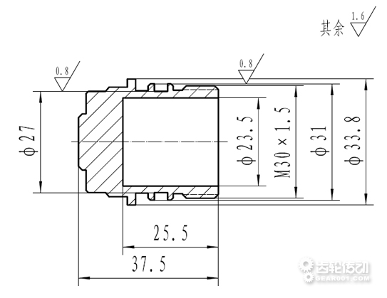 旋轉(zhuǎn)類零件如某螺塞零件,最大外圓直徑為φ33.8,材料為TC4,原材料選用φ30棒材。零件采用一次車削加工完成(如圖1)。為了保證零件加工精度,加工設(shè)備選用了進(jìn)口數(shù)控車床,其主軸轉(zhuǎn)速最高6000轉(zhuǎn)/分,主軸跳動(dòng)小于2μm,加工時(shí)主軸震動(dòng)極小加工穩(wěn)定性好,冷卻液可由3個(gè)方向噴出,冷卻充分。