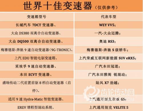 在今年6月,中國汽車評價研究院主辦了世界十佳變速器評選活動,近日評選結果正式揭曉,長城、大眾、奔馳、上汽、本田、通用、別克等車企傳動總成均上榜。